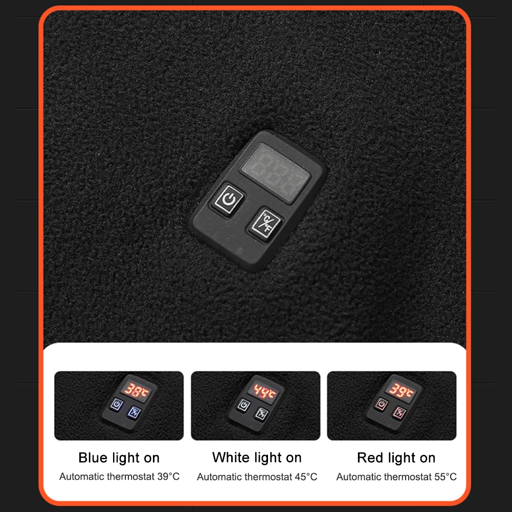3. Intelligent Temperature Control: Take control of your comfort with the intelligent temperature control feature of this heated jacket. With a simple and intuitive operation, long-press the power button for 3 seconds to turn on the jacket, then easily adjust the temperature according to your preference by gently pressing the button. The blue light indicates an automatic constant temperature at 39°C, white light at 45°C, and red light at 55°C. Enjoy personalized warmth tailored to your needs and weather conditions.